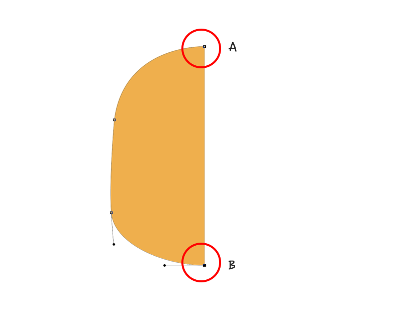— 在工具栏中使用钢笔工具,按下图画出鸟身体的一半(颜色随意),这里需要注意的是A,B两点的控制线需保持水平(如下图),这是为了下一步的镜像合并。