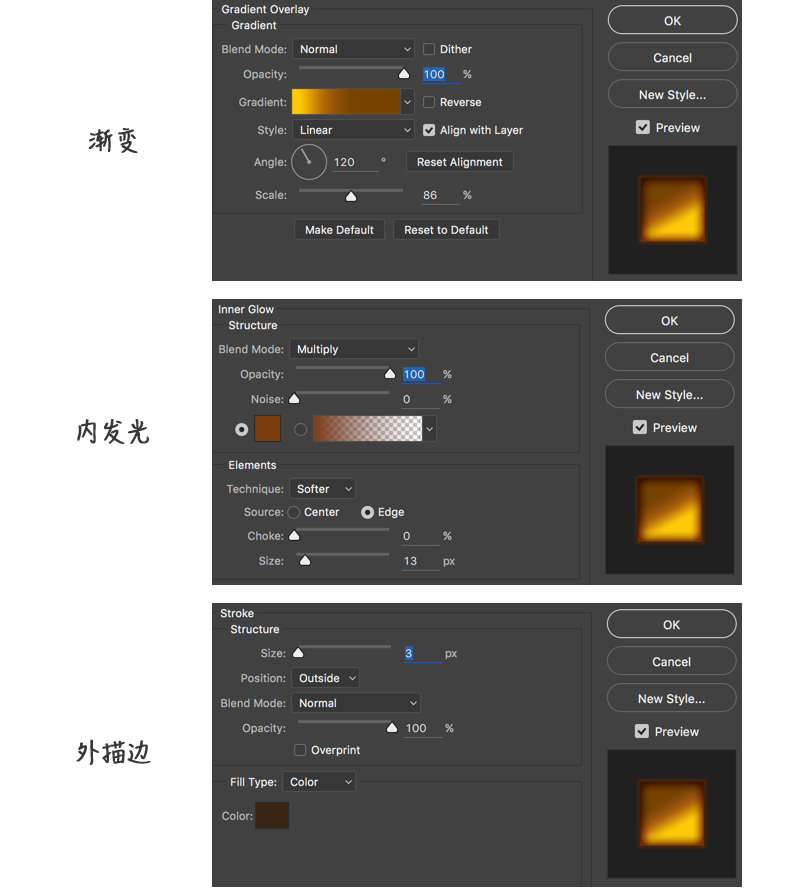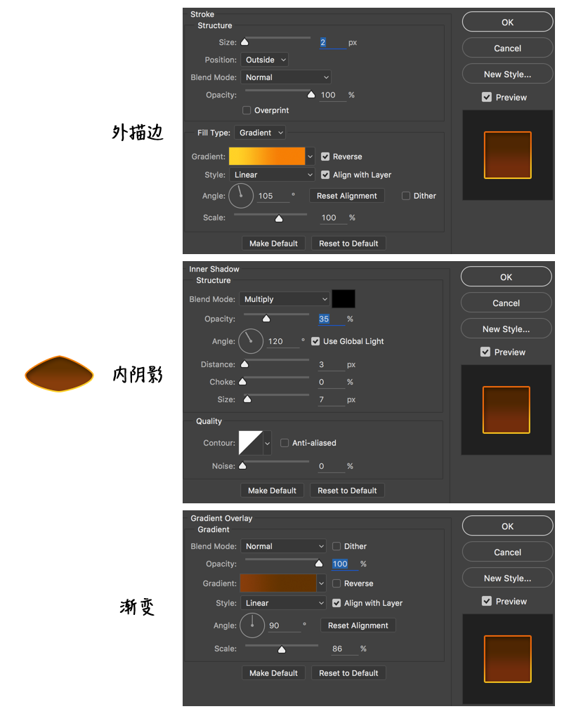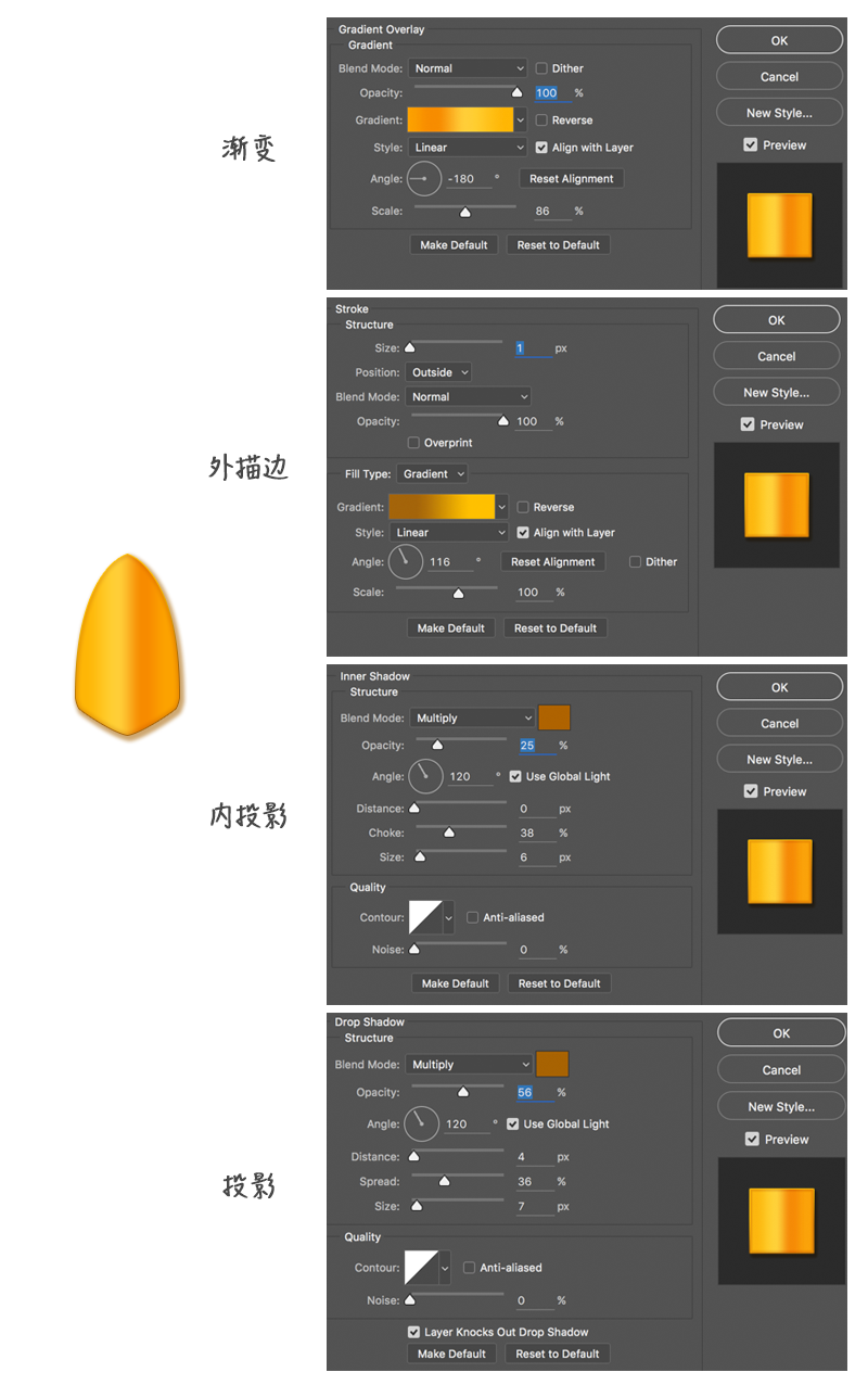 先用钢笔工具画出基本形状,并设置图层样式如下图;