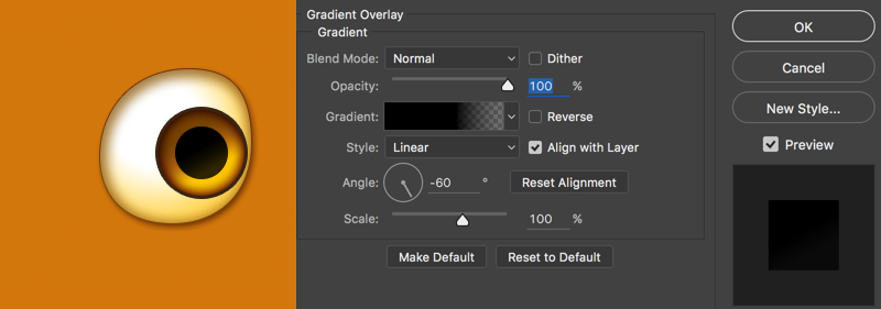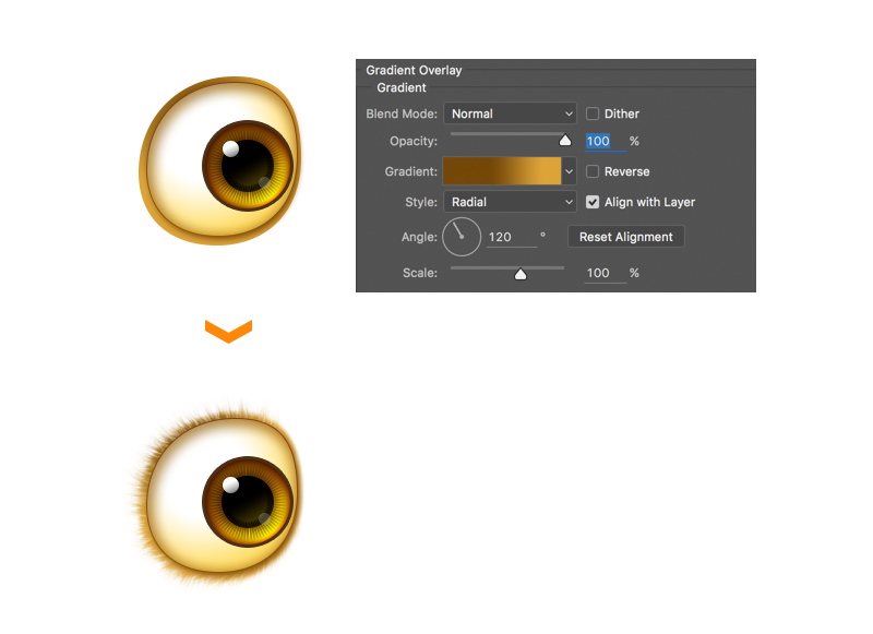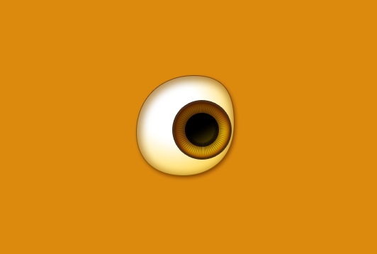眼睛内部的纹理。新建两个矩形,填充为#45270b,然后旋转360°。添加蒙版,放射渐变(外虚内实)。最后将混合模式选为叠加。将纹理图层放在黑色瞳孔图层下面,如图所示: