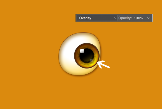 为了增加眼睛的通透感,新建图层,画一个大小如下图箭头所指的圆略小一圈的圆。填充为白色,添加蒙版擦除上半部分。最后将混合模式设置为叠加