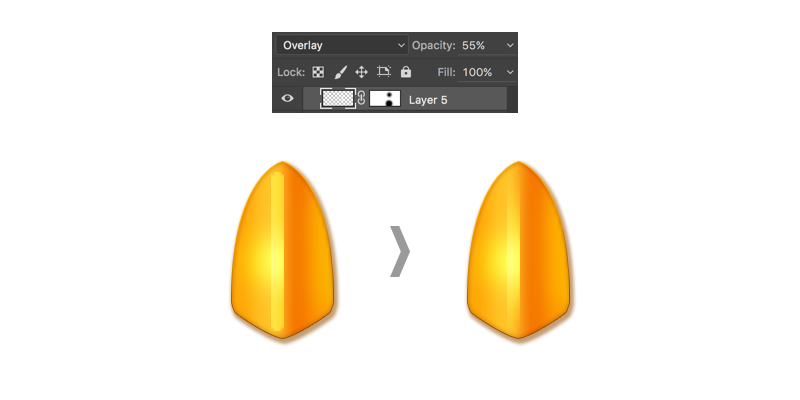 画一个矩形,填充为白色,将混合模式设置为“叠加”,将图层透明度降至55%,利用蒙版将上下部分擦除。这样嘴巴的形状结构更加明显,如下图所示: